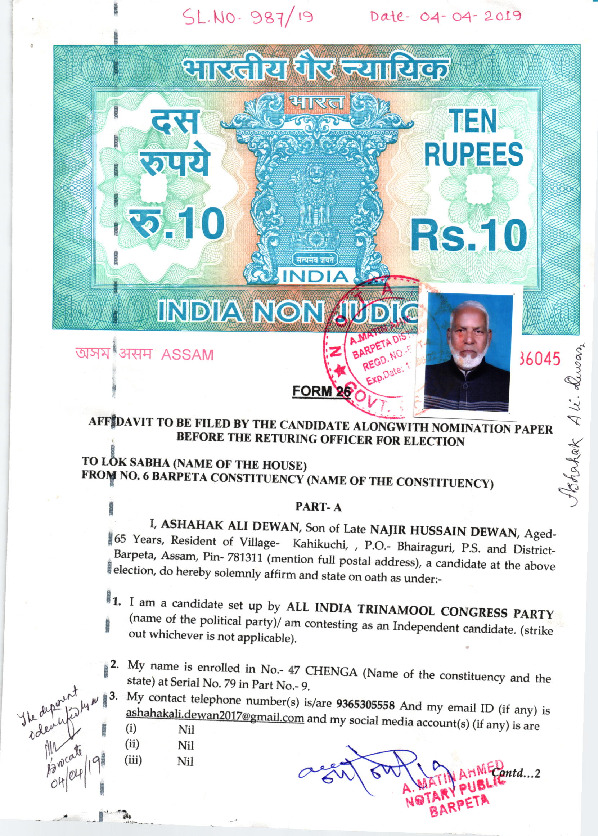 | Assam | Barpeta | Tuesday, 23 April 2019 | Ashahak Ali Dewan(Affadavit) | Abdul Khaleque |