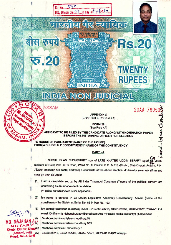 | Assam | Dhubri | Tuesday, 23 April 2019 | Nurul Islam Choudhury(Affadavit) | Badruddin Ajmal |