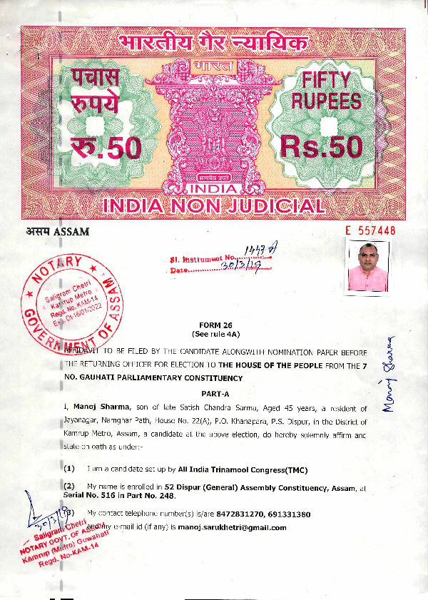 | Assam | Gauhati | Tuesday, 23 April 2019 | Manoj Sharma(Affadavit) | Queen Oja |