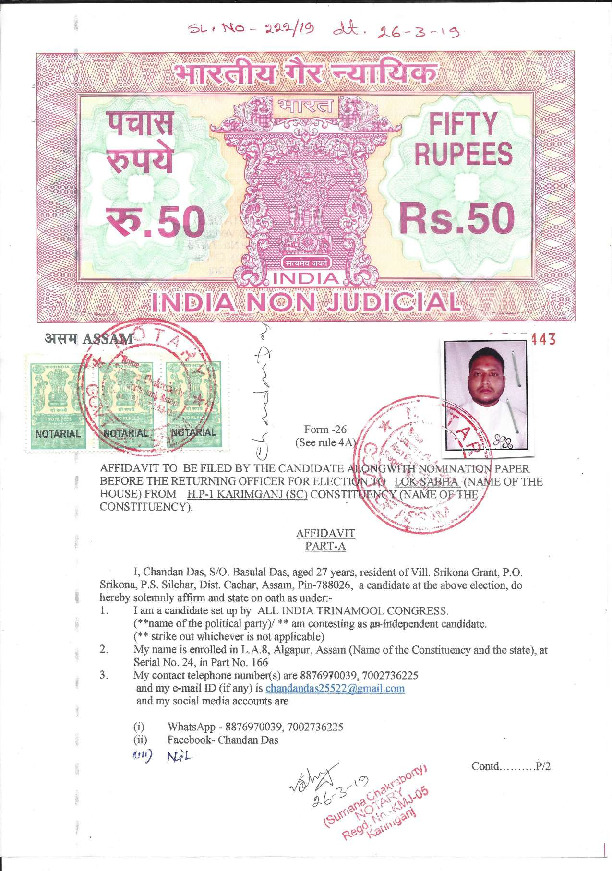 | Assam | Karimganj | Thursday, 18 April 2019 | Chandan Das(Affadavit) | Kripanath Mallah |