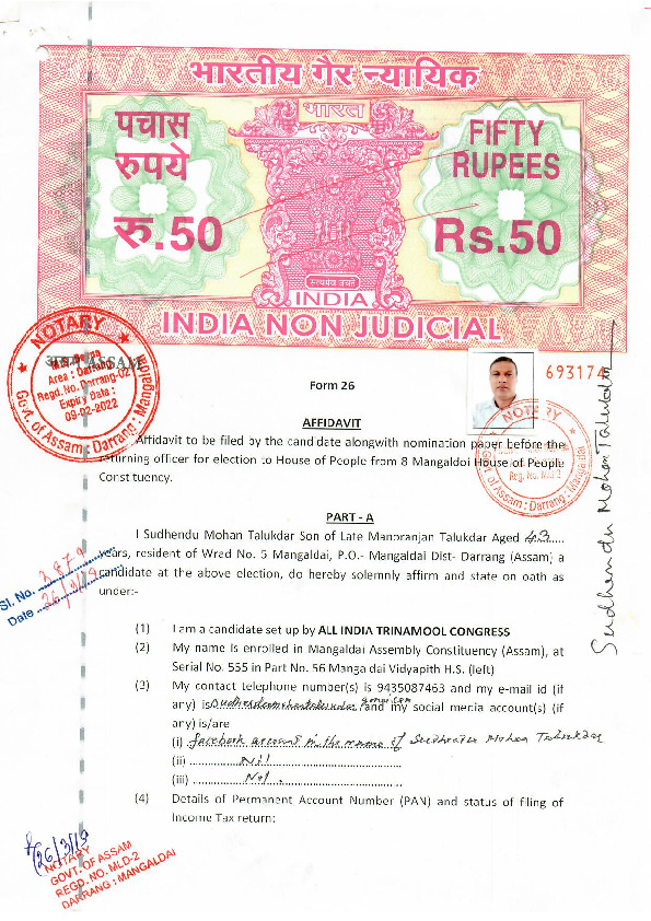 | Assam | Mangaldoi | Thursday, 18 April 2019 | Sudhendu Mohan Talukdar(Affadavit) | Dilip Saikia |