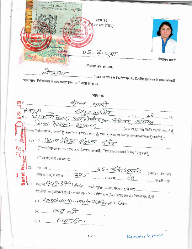 | Jharkhand | Kodarma | Monday, 6 May 2019 | Kanchan Kumari(Affadavit) | Annpurna Devi |