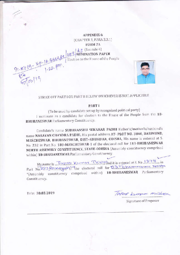 | Odisha | Bhubaneswar | Tuesday, 23 April 2019 | Subhranshu Sekhar Padhi(Affadavit) | Aparajita Sarangi |