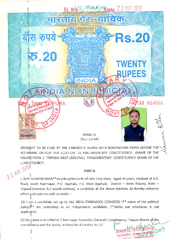 | Tripura | Tripura West | Thursday, 11 April 2019 | Maman Khan(Affadavit) | Pratima Bhoumik |