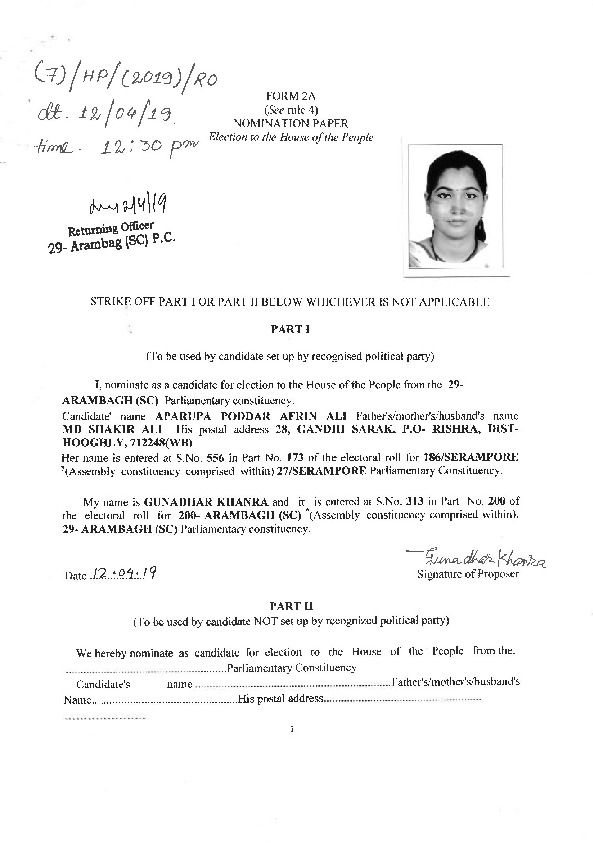 | West Bengal | Arambagh | Monday, 6 May 2019 | Aparupa Poddar (afrin Ali)(Affadavit) | Aparupa Poddar (afrin Ali) |