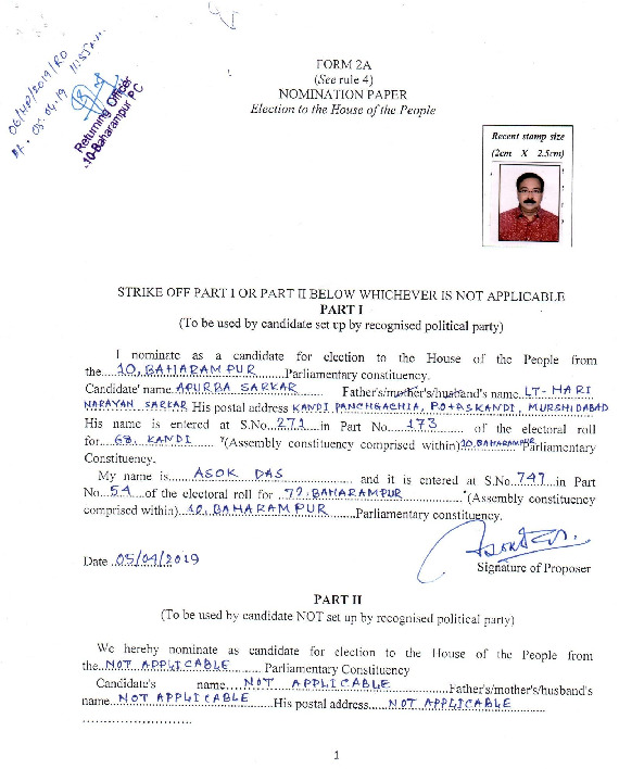 | West Bengal | Baharampur | Monday, 29 April 2019 | Apurba Sarkar (david)(Affadavit) | Adhir Ranjan Chowdhury |