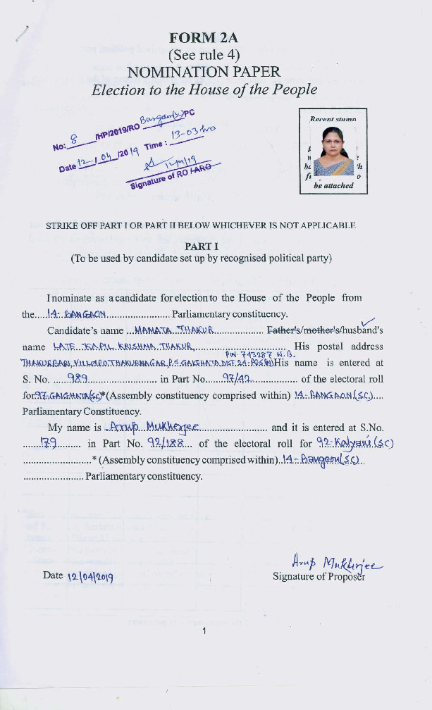 | West Bengal | Bangaon | Monday, 6 May 2019 | Mamata Thakur(Affadavit) | Shantanu Thakur |