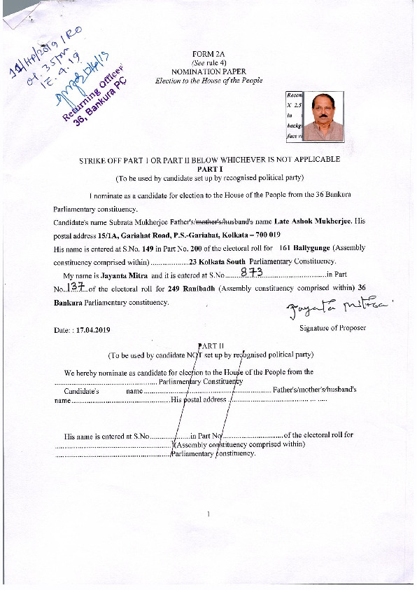 | West Bengal | Bankura | Sunday, 12 May 2019 | Subrata Mukherjee(Affadavit) | Dr. Subhas Sarkar |