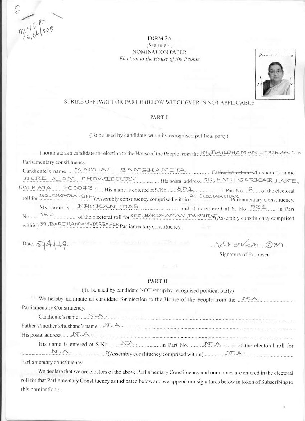 | West Bengal | Bardhaman-durgapur | Monday, 29 April 2019 | Mamtaz Sanghamita(Affadavit) | S.s Ahluwalia |