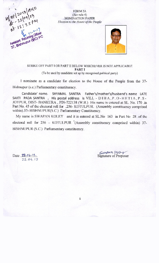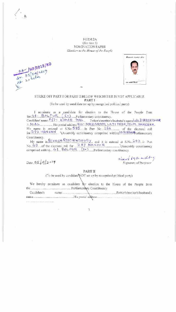 | West Bengal | Bolpur | Monday, 29 April 2019 | Asit Kumar Mal(Affadavit) | Asit Kumar Mal |