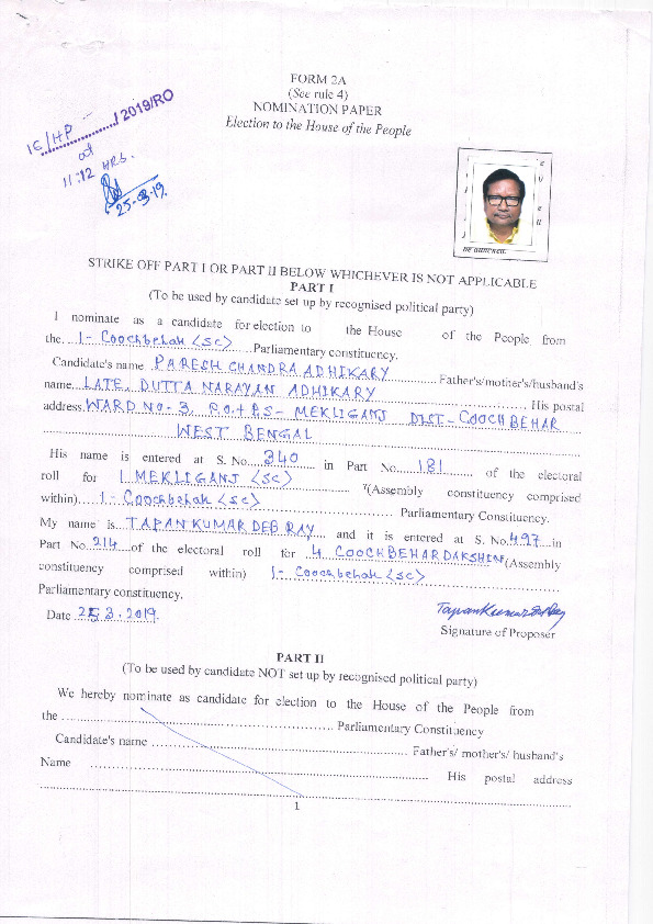 | West Bengal | Cooch Behar | Thursday, 11 April 2019 | Paresh Chandra Adhikary(Affadavit) | Nisith Pramanik |
