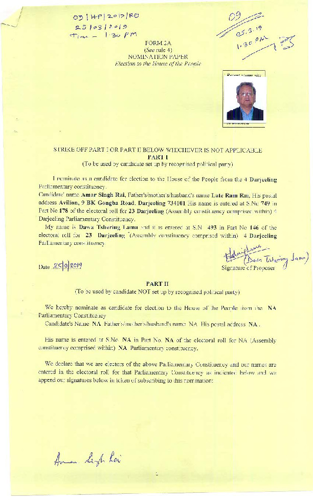 | West Bengal | Darjeeling | Thursday, 18 April 2019 | Amar Singh Rai(Affadavit) | Raju Bista |