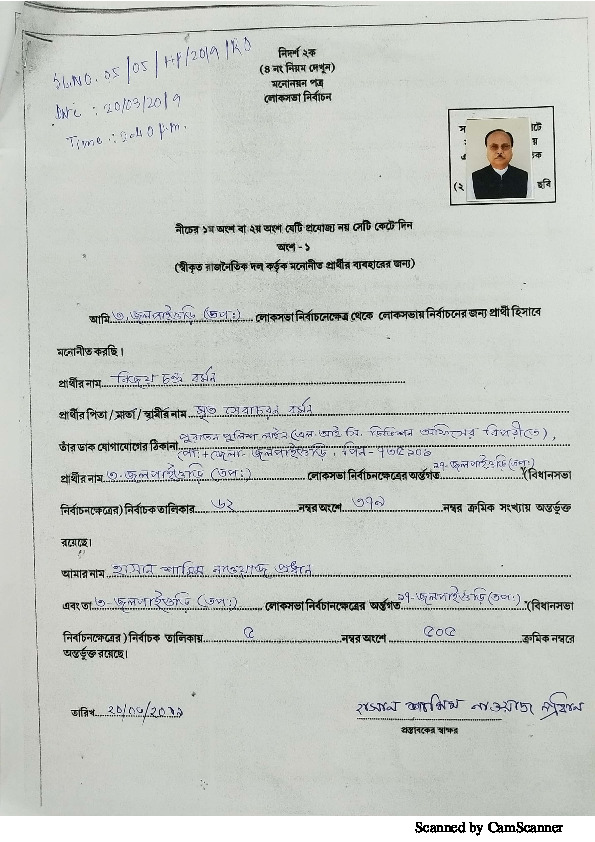 | West Bengal | Jalpaiguri | Thursday, 18 April 2019 | Bijoy Chandra Barman(Affadavit) | Dr. Jayanta Kumar Roy |