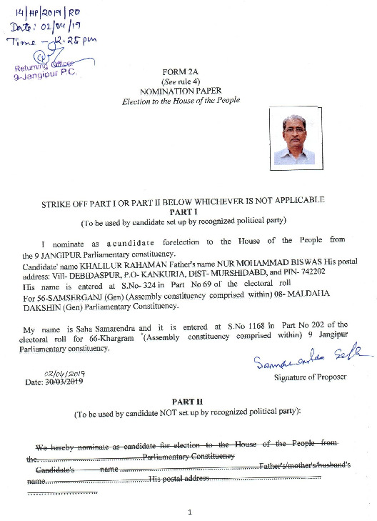 | West Bengal | Jangipur | Tuesday, 23 April 2019 | Khalilur Rahaman(Affadavit) | Khalilur Rahaman |