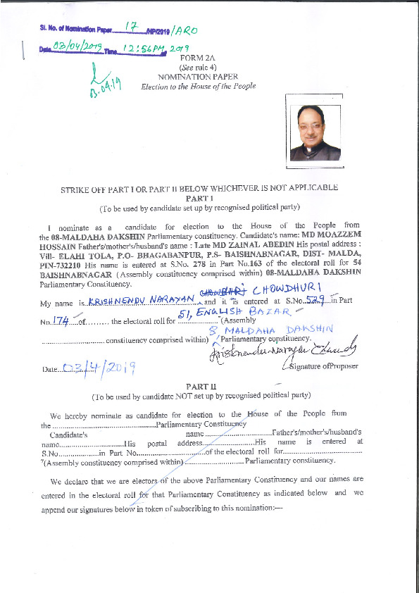 | West Bengal | Maldaha Dakshin | Tuesday, 23 April 2019 | Md Moazzem Hossain(Affadavit) | Abu Hasem Khan Chowdhury (dalu) |