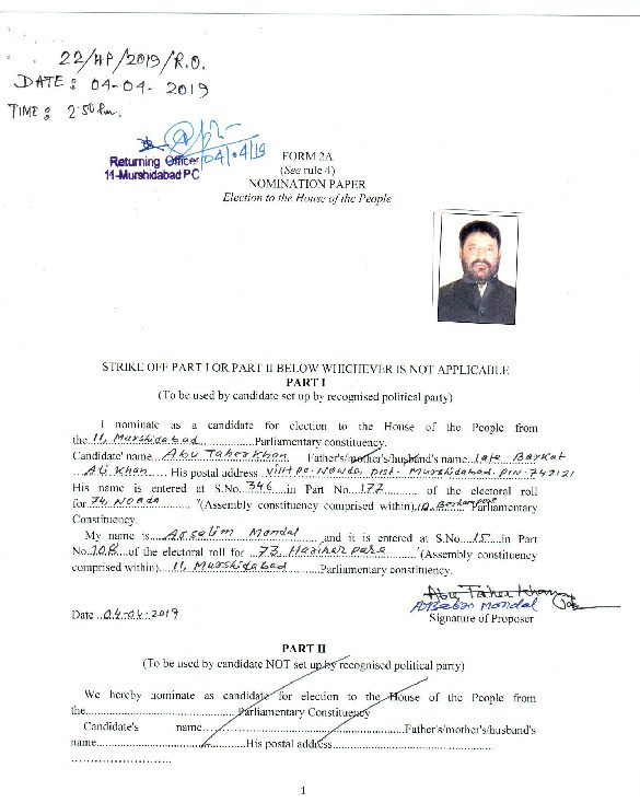 | West Bengal | Murshidabad | Tuesday, 23 April 2019 | Abu Taher Khan(Affadavit) | Abu Taher Khan |