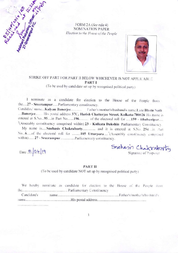 | West Bengal | Srerampur | Monday, 6 May 2019 | Kalyan Banerjee(Affadavit) | Kalyan Banerjee |