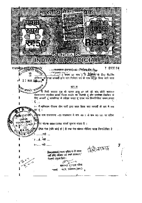 | രാജസ്ഥാൻ | Rajsamand | Monday, 29 April 2019 | Mishri Kathat(Affadavit) | Diya Kumari |
