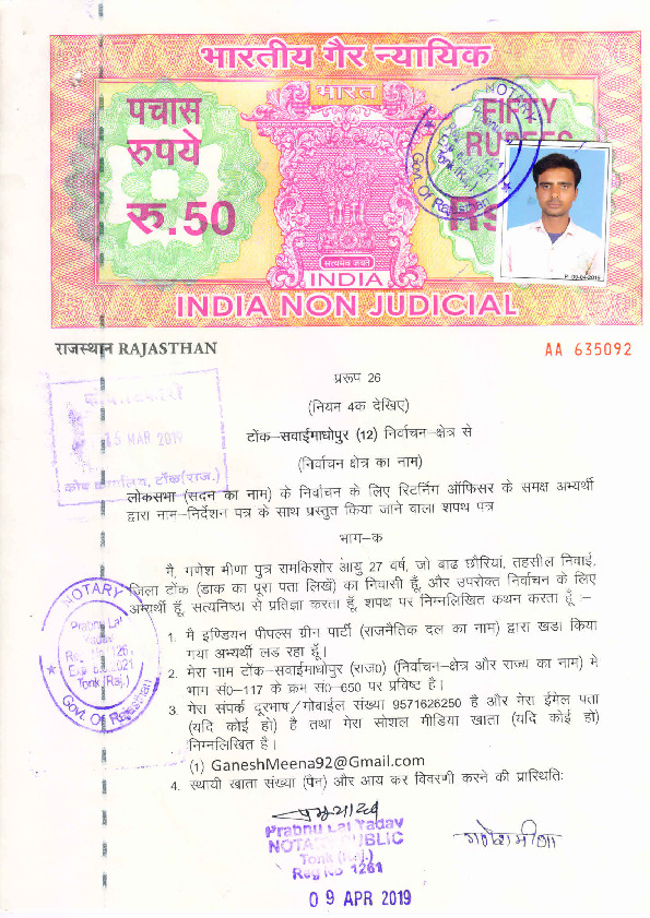 | രാജസ്ഥാൻ | Tonk-sawai Madhopur | Monday, 29 April 2019 | Ganesh Meena(Affadavit) | Sukhbir Singh Jaunapuria |