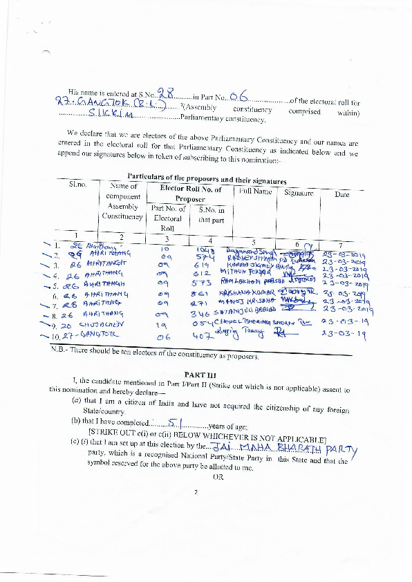 | സിക്കിം | സിക്കിം | Thursday, 11 April 2019 | Sunmaya Gurung(Affadavit) | Indra Hang Subba |
