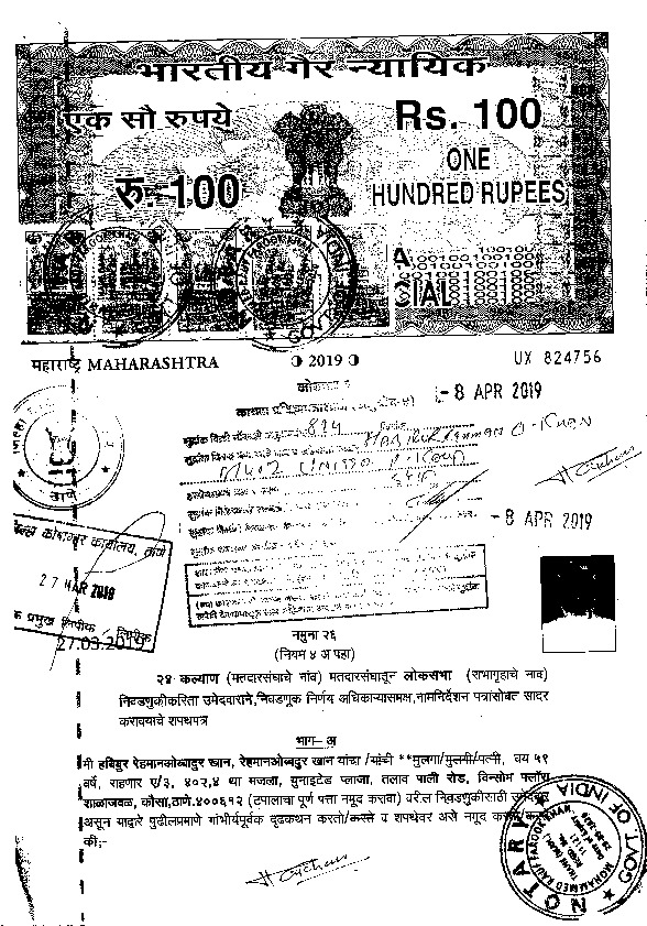 | മഹാരാഷ്ട്ര | കല്യാൺ | Monday, 29 April 2019 | Habibur Rehman(Affadavit) | Dr. Shrikant Eknath Shinde |