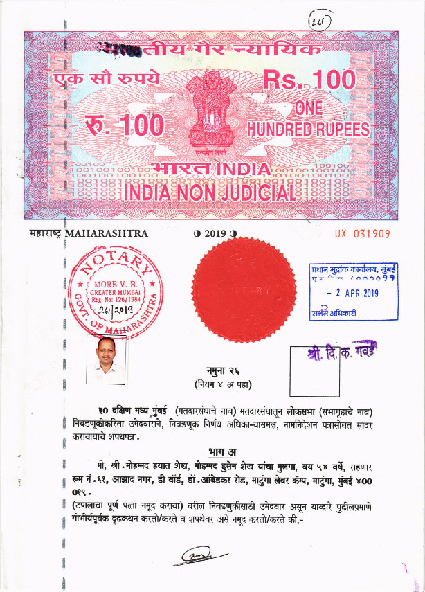 | മഹാരാഷ്ട്ര | Mumbai South Central | Monday, 29 April 2019 | Mohammad Hayat Mohammad Husain Shaikh(Affadavit) | Rahul Ramesh Shewale |