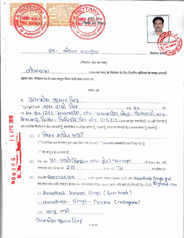 | ഝാർഖണ്ഡ് | Kodarma | Monday, 6 May 2019 | Avadhesh Kumar Singh(Affadavit) | Annpurna Devi |