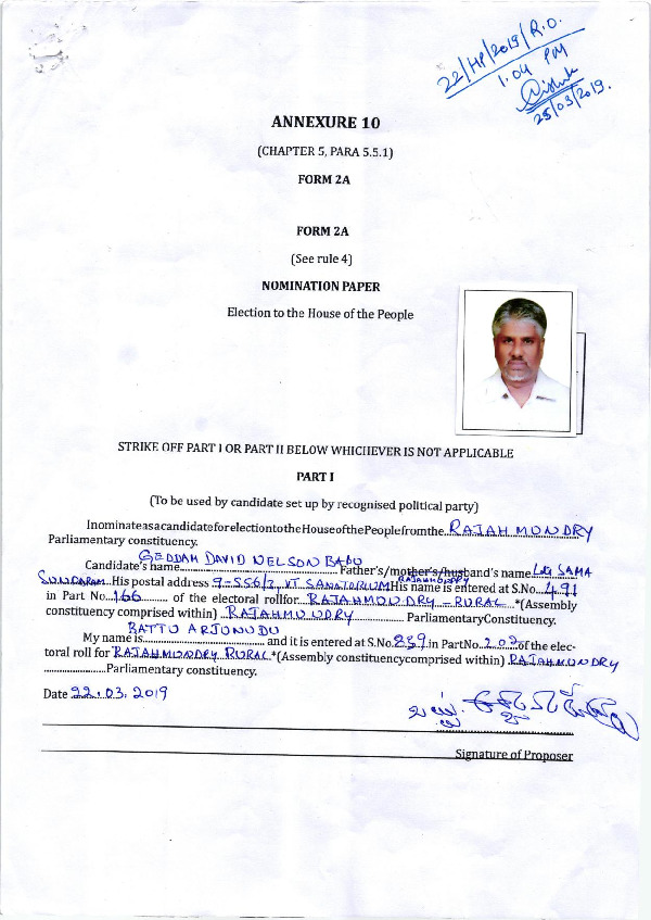 | ஆந்திரப் பிரதேசம் | ராஜமன்றி | Thursday, 11 April 2019 | Geddam David Nelson Babu(Affadavit) | Margani Bharat |