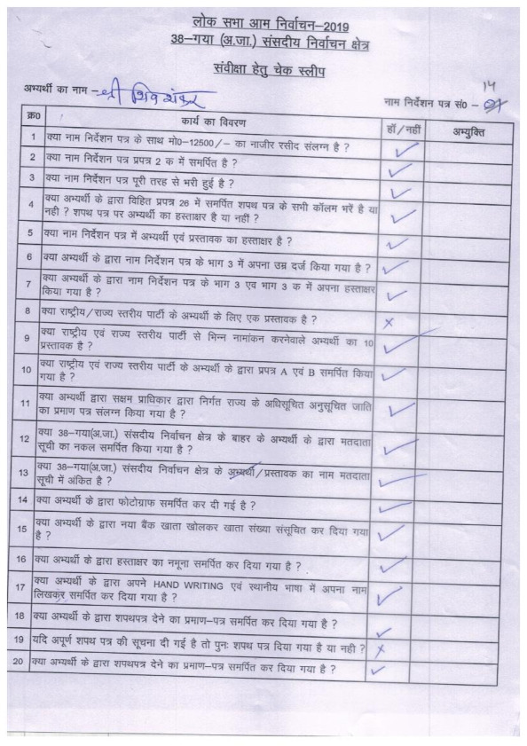 | பீகார் | Gaya | Thursday, 11 April 2019 | Shiv Shankar(Affadavit) | Vijay Kumar |