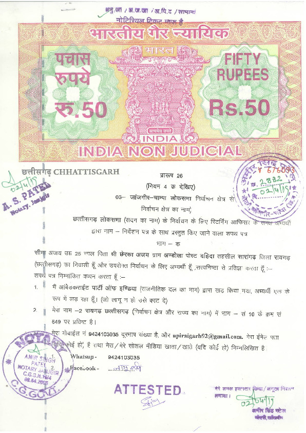 | சத்தீசுகர் | பிலாசுப்பூர் | Tuesday, 23 April 2019 | Eg. Ramfal Mandrey(Affadavit) | Arun Sao |