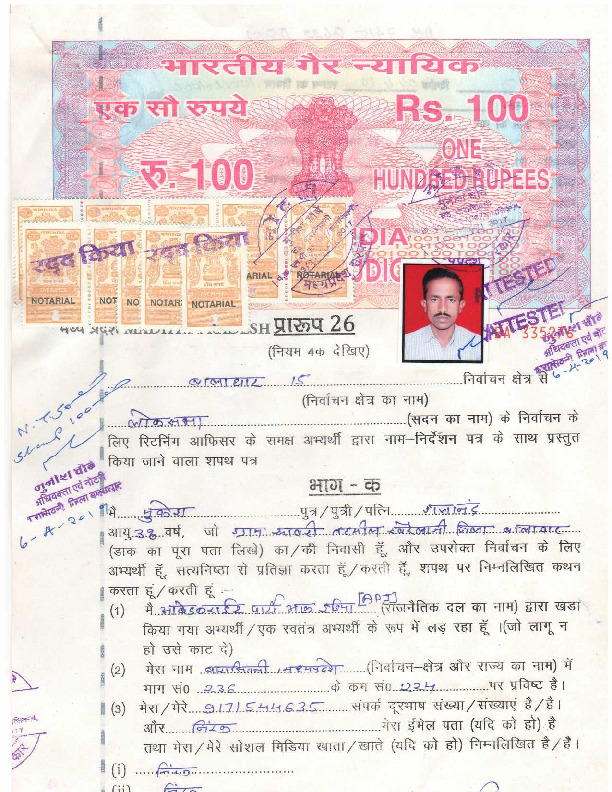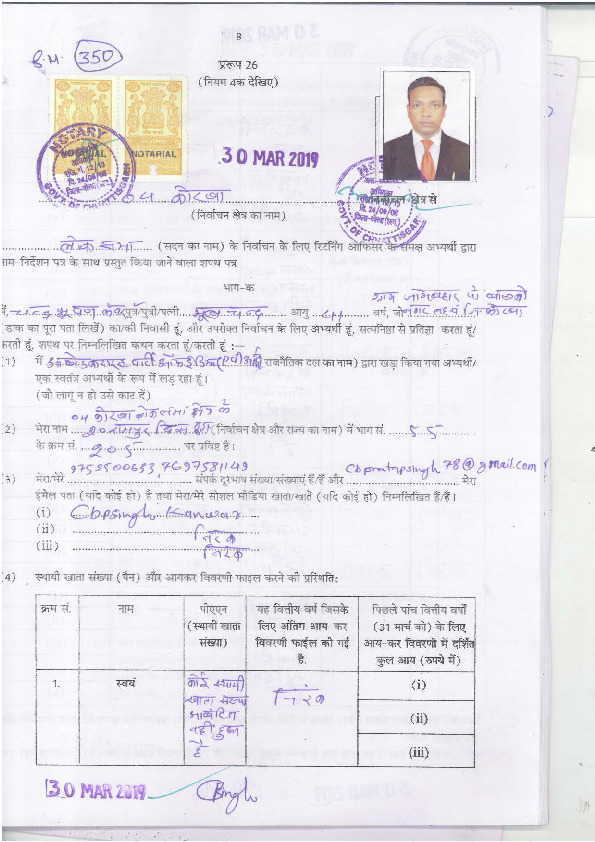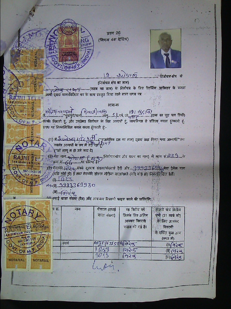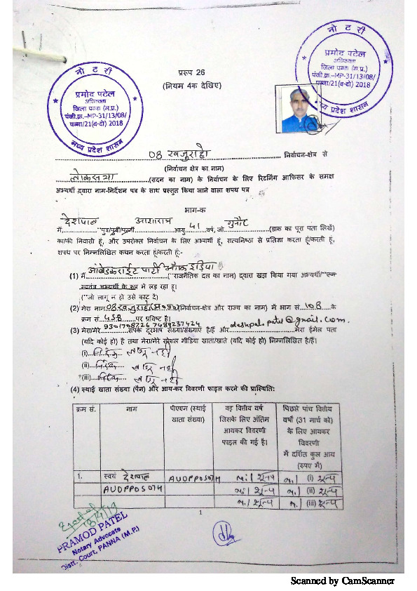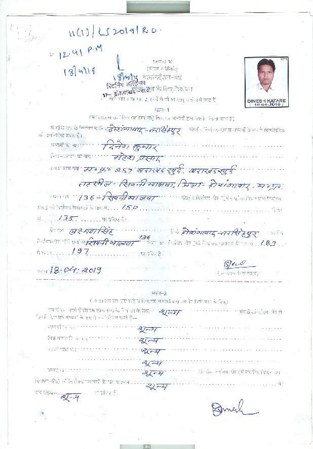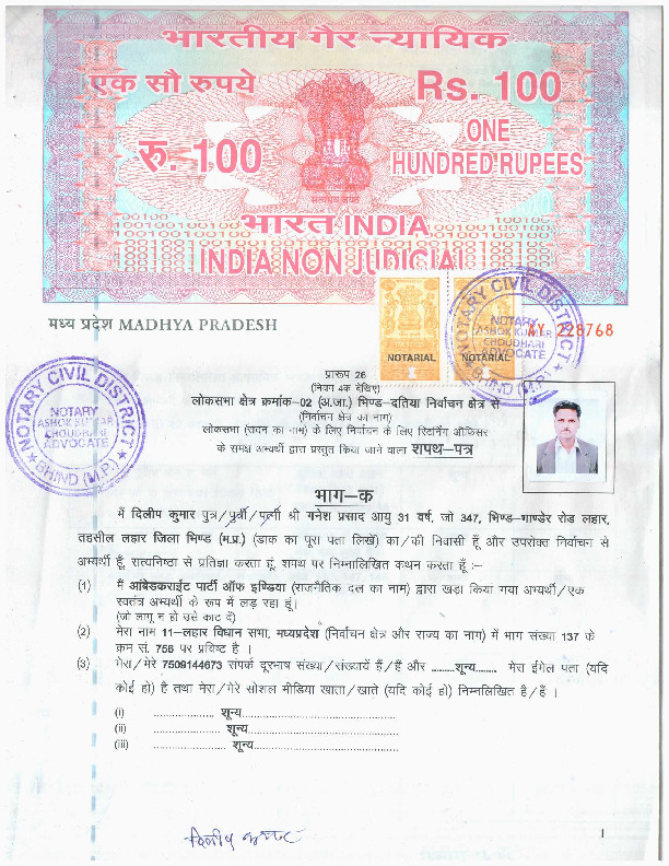 | மத்தியப் பிரதேசம் | Bhind | Sunday, 12 May 2019 | Dileep Kumar Dohare (advocat)(Affadavit) | Sandhya Ray |