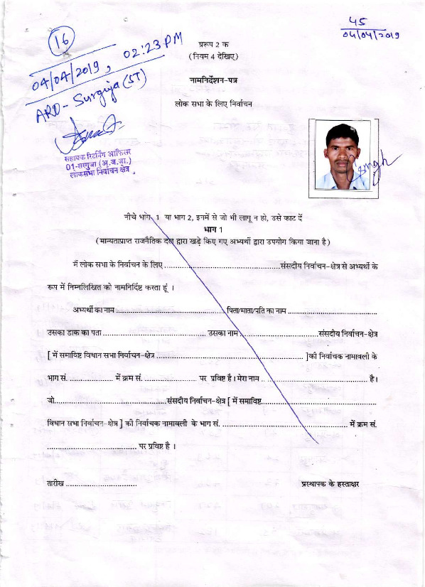 | சத்தீசுகர் | Sarguja | Tuesday, 23 April 2019 | Guman Singh Poya(Affadavit) | Renuka Singh Saruta |