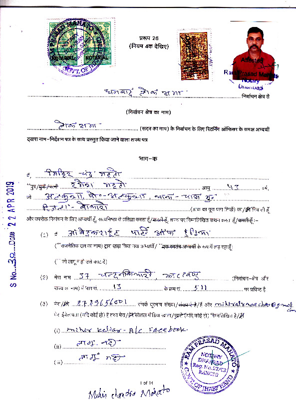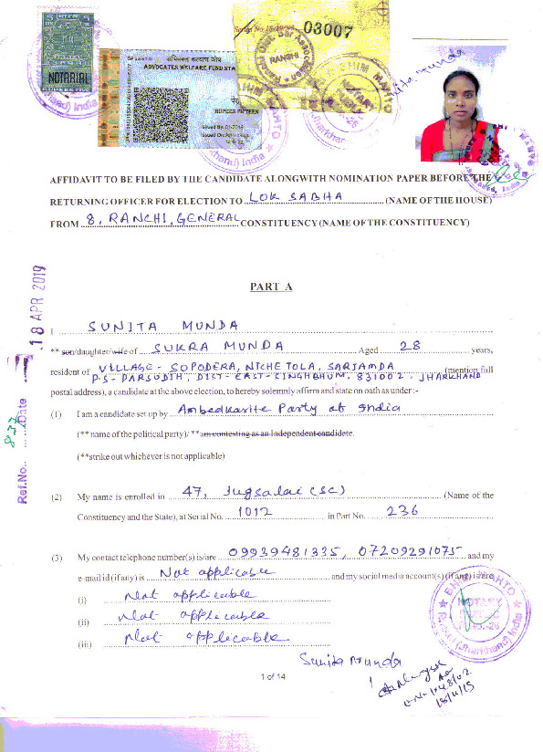 | சார்க்கண்ட் | ராஞ்சி | Monday, 6 May 2019 | Sunita Munda(Affadavit) | Sanjay Seth |