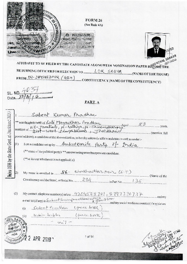 | சார்க்கண்ட் | ஜம்சேத்பூர் | Sunday, 12 May 2019 | Subrat Kumar Pradhan(Affadavit) | Bidyut Baran Mahato |
