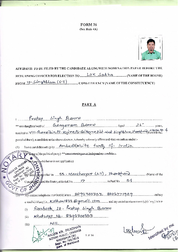 | சார்க்கண்ட் | Singhbhum | Sunday, 12 May 2019 | Pratap Singh Banara(Affadavit) | Geeta Kora |