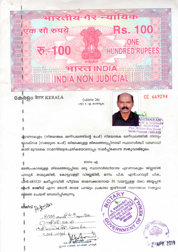 | கேரளம் | எர்ணாகுளம் | Tuesday, 23 April 2019 | Rajeev(Affadavit) | Hibi Eden |