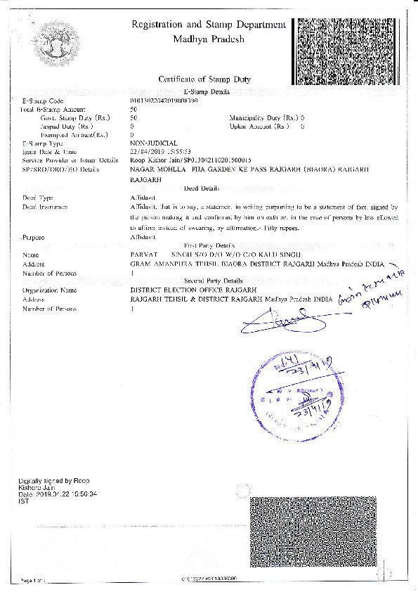 | மத்தியப் பிரதேசம் | Rajgarh | Sunday, 12 May 2019 | Parvat Singh(Affadavit) | Rodmal Nagar |