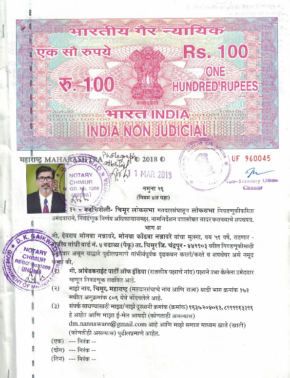 | மகாராட்டிரம் | Gadchiroli-chimur | Thursday, 11 April 2019 | Deorao Monba Nannaware(Affadavit) | Ashok Mahadeorao Nete |