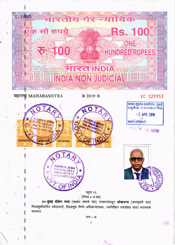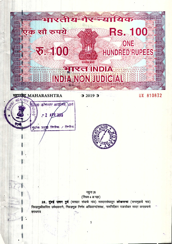 | மகாராட்டிரம் | வடகிழக்கு மும்பை மக்களவைத் தொகுதி | Monday, 29 April 2019 | Dandge Sukhadev Chandu(Affadavit) | Manoj Kotak |