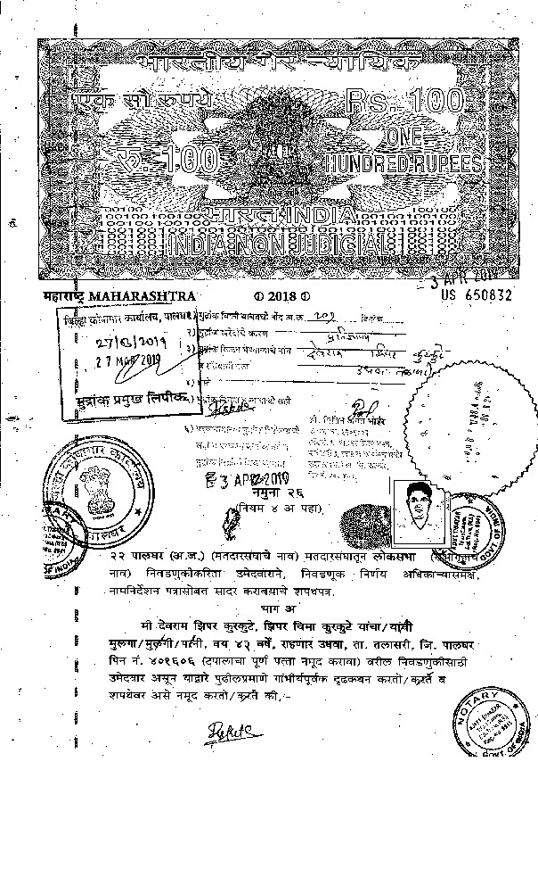 | மகாராட்டிரம் | Palghar | Monday, 29 April 2019 | Devram Zipar Kurkute(Affadavit) | Rajendra Dhedya Gavit |