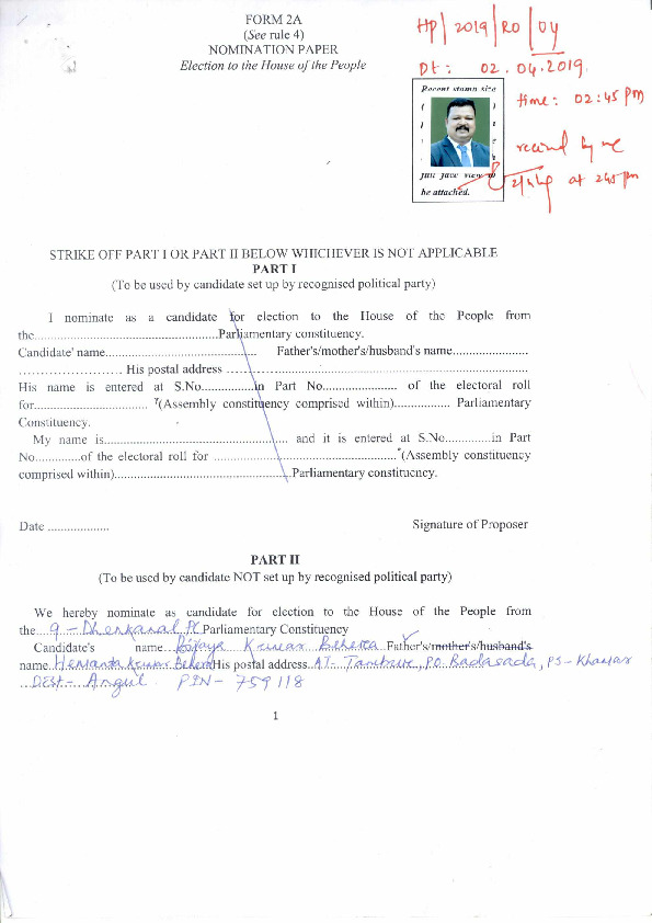 | ஒடிசா | Dhenkanal | Tuesday, 23 April 2019 | Bijaya Kumar Behera(Affadavit) | Mahesh Sahoo |