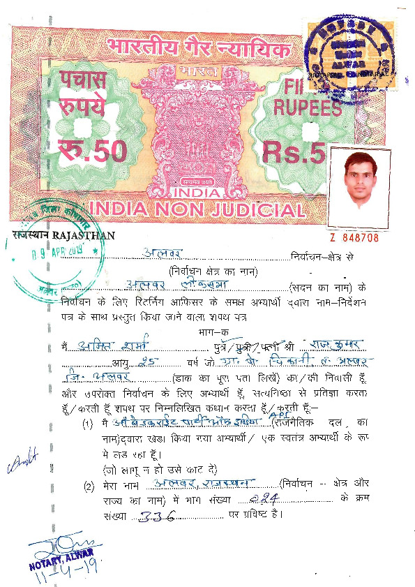 | ராஜஸ்தான் | அல்வார் | Monday, 6 May 2019 | Amit Sharma(Affadavit) | Balak Nath |