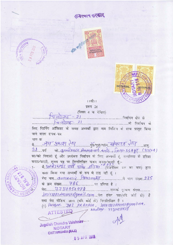 | ராஜஸ்தான் | சித்தோர்கார் | Monday, 29 April 2019 | Jai Prakash Regar(Affadavit) | Chandra Prakash Joshi |