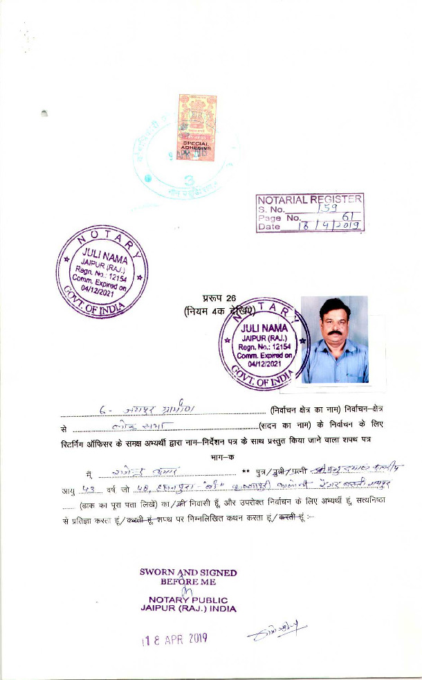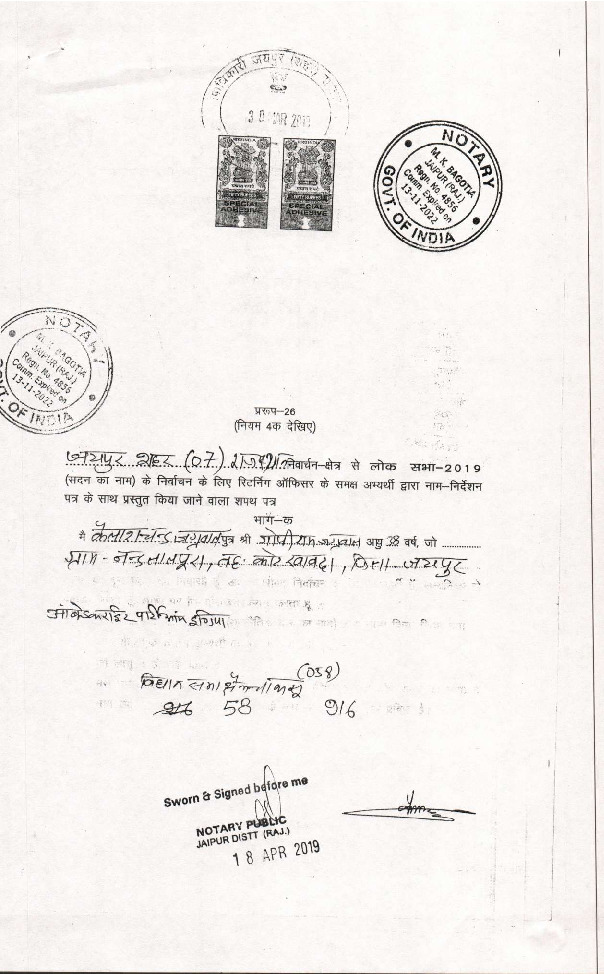| ராஜஸ்தான் | செய்ப்பூர் | Monday, 6 May 2019 | Kailash Chand Jagarwal(Affadavit) | Ramcharan Bohra |