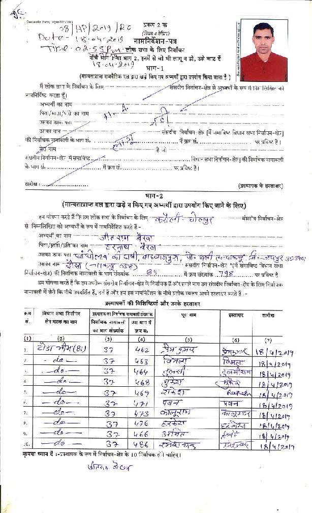 | ராஜஸ்தான் | Karauli-dholpur | Monday, 6 May 2019 | Jeet Ram Bairwa(Affadavit) | Manoj Rajoria |