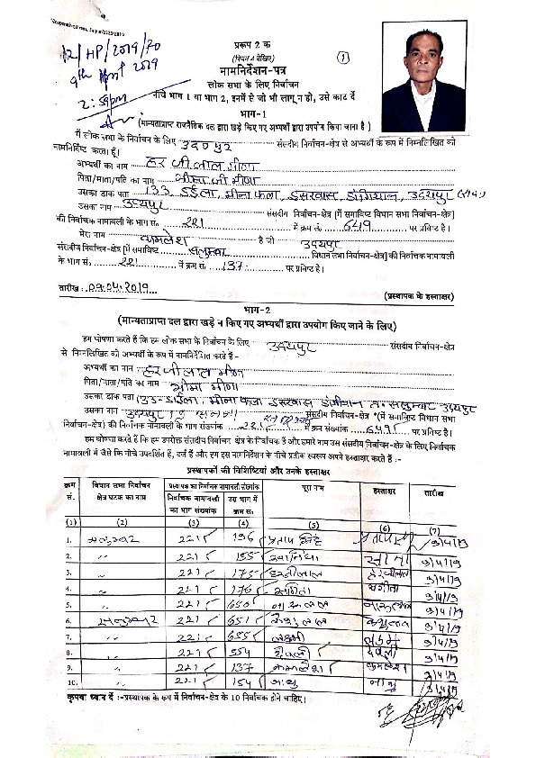 | ராஜஸ்தான் | உதயப்பூர் | Monday, 29 April 2019 | Harji Lal Meena(Affadavit) | Arjunlal Meena |