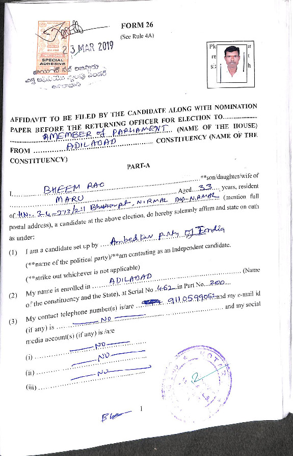 | தெலங்காணா | ஆதிலாபாத் | Thursday, 11 April 2019 | Bheem Rao(Affadavit) | Godam,shri Nagesh |
