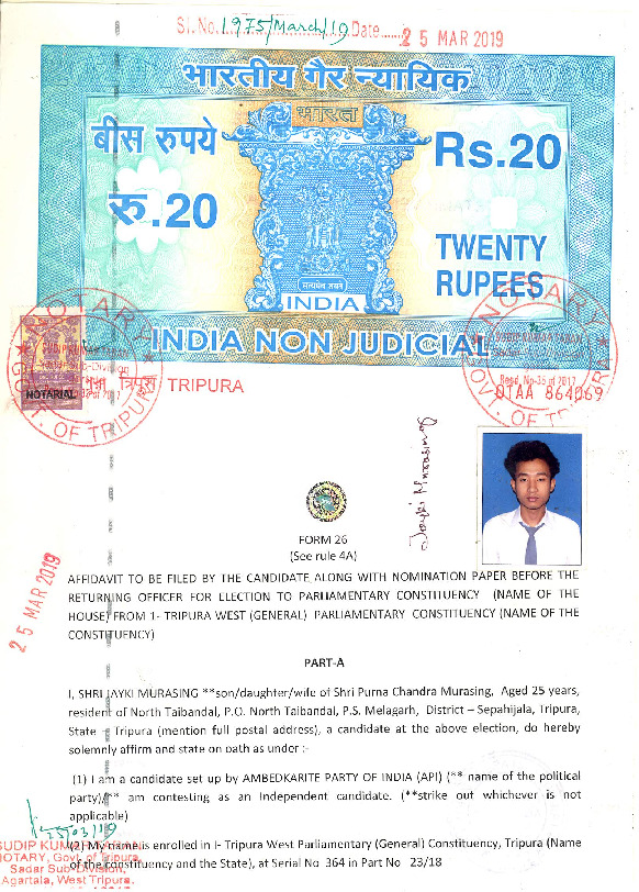 | திரிபுரா | மேற்கு திரிபுரா மக்களவைத் தொகுதி | Thursday, 11 April 2019 | Jayki Murasing(Affadavit) | Pratima Bhoumik |
