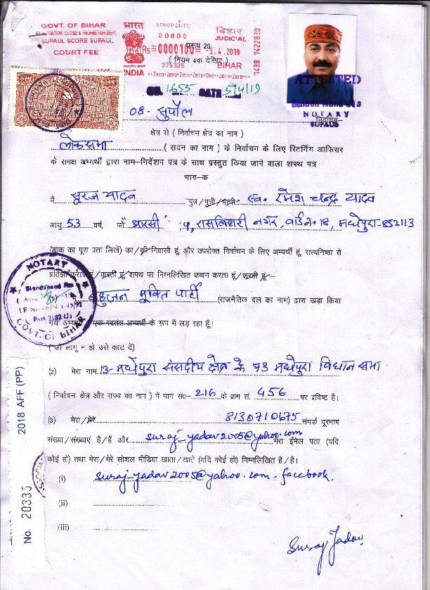 | பீகார் | Supaul | Tuesday, 23 April 2019 | Suraj Yadav(Affadavit) | Dileshwar Kamait |