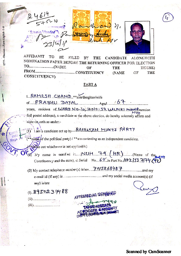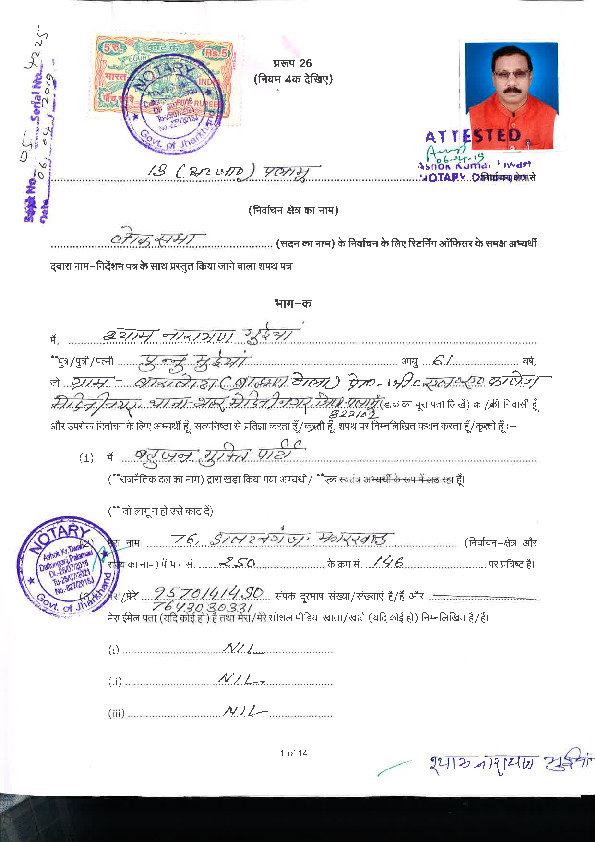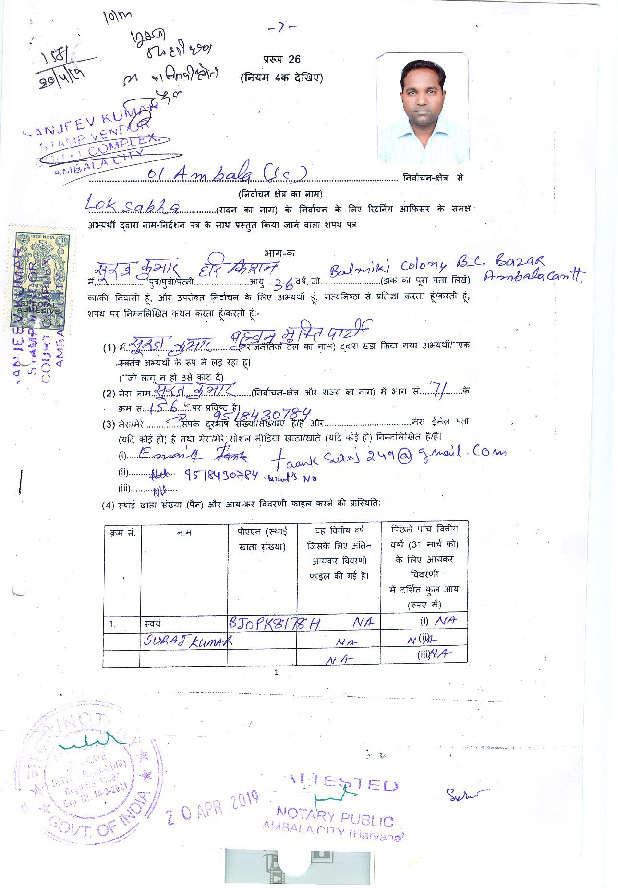 | அரியானா | அம்பாலா, அம்பாலா மாவட்டம் | Sunday, 12 May 2019 | Suraj Kumar(Affadavit) | Rattan Lal Kataria |
